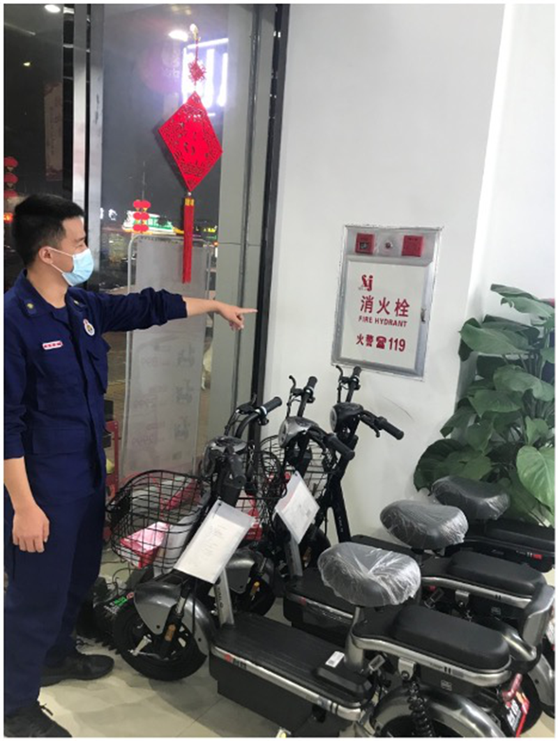 在一間電動自行車銷售店,檢查人員發(fā)現(xiàn)幾輛嶄新的電動自行車攔在了消防栓前,把底下的滅火器遮得嚴嚴實實?!笆覂?nèi)消防栓被遮擋,如果發(fā)生火災(zāi)事故,會直接影響火災(zāi)救援的速度。況且滅火器是處理初期火災(zāi)最好的工具,把車放在這兒擋著,假如發(fā)生火災(zāi),后果不堪設(shè)想?!毕辣O(jiān)督員對商家負責(zé)人進行批評教育后要求其現(xiàn)場整改。
