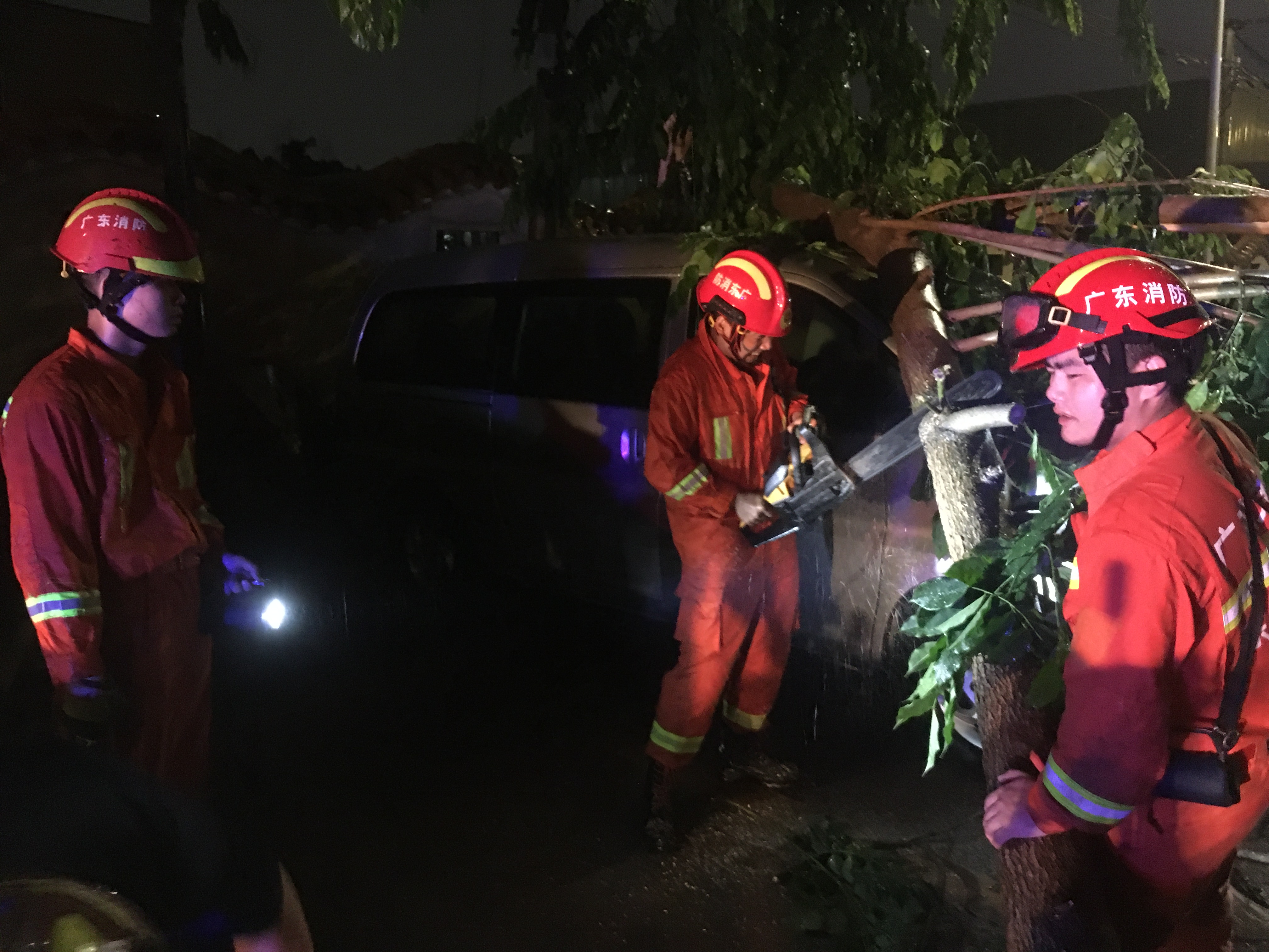 在厚街鎮(zhèn)汀山社區(qū),路邊一大樹(shù)突然倒下,一輛私家車(chē)被倒下來(lái)的樹(shù)干砸中車(chē)頭,幸好車(chē)內(nèi)無(wú)人,厚街鎮(zhèn)消防救援大隊(duì)接警到場(chǎng)后使用機(jī)動(dòng)鏈鋸、手動(dòng)拉鋸等工具,經(jīng)過(guò)約40分鐘左右的緊張救援,成功將倒下的樹(shù)干鋸開(kāi),將車(chē)輛轉(zhuǎn)移到安全區(qū)域。